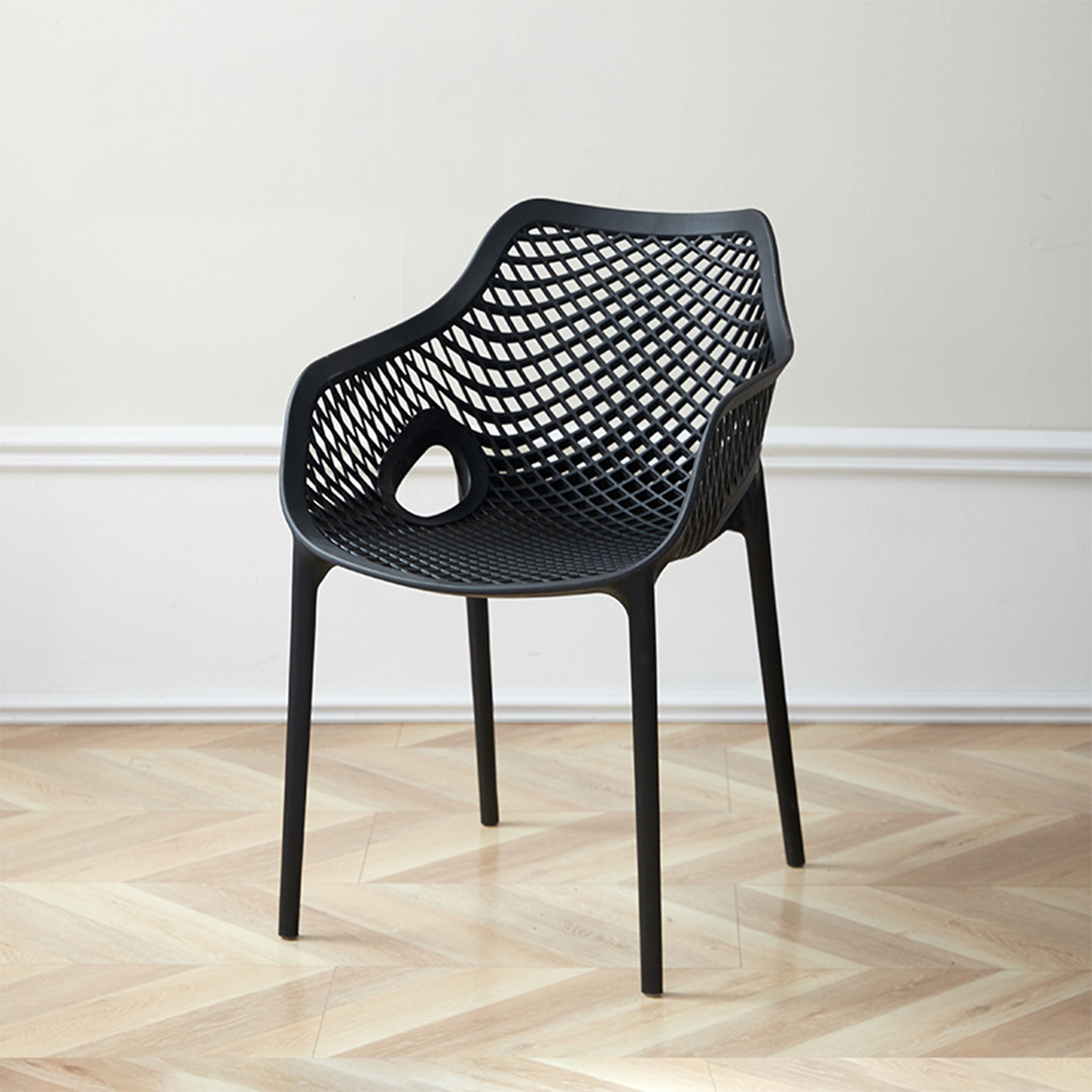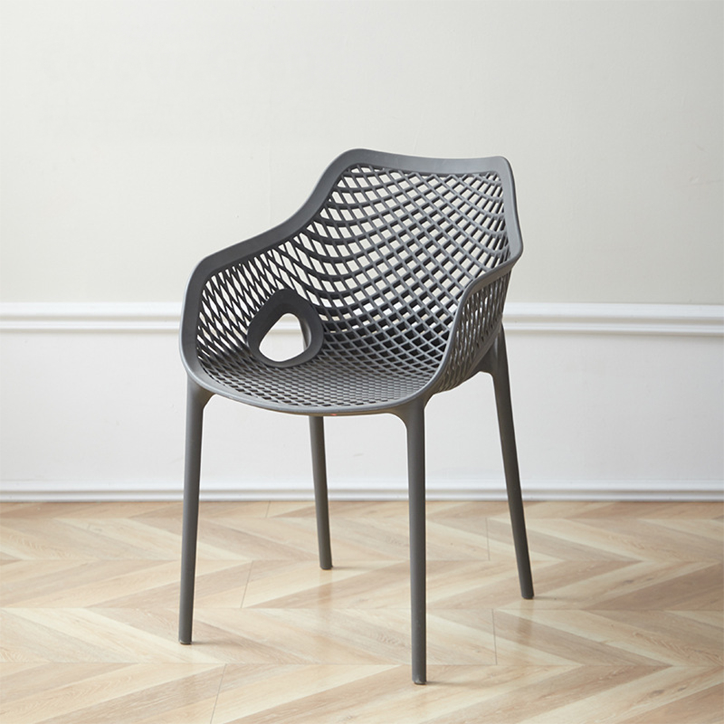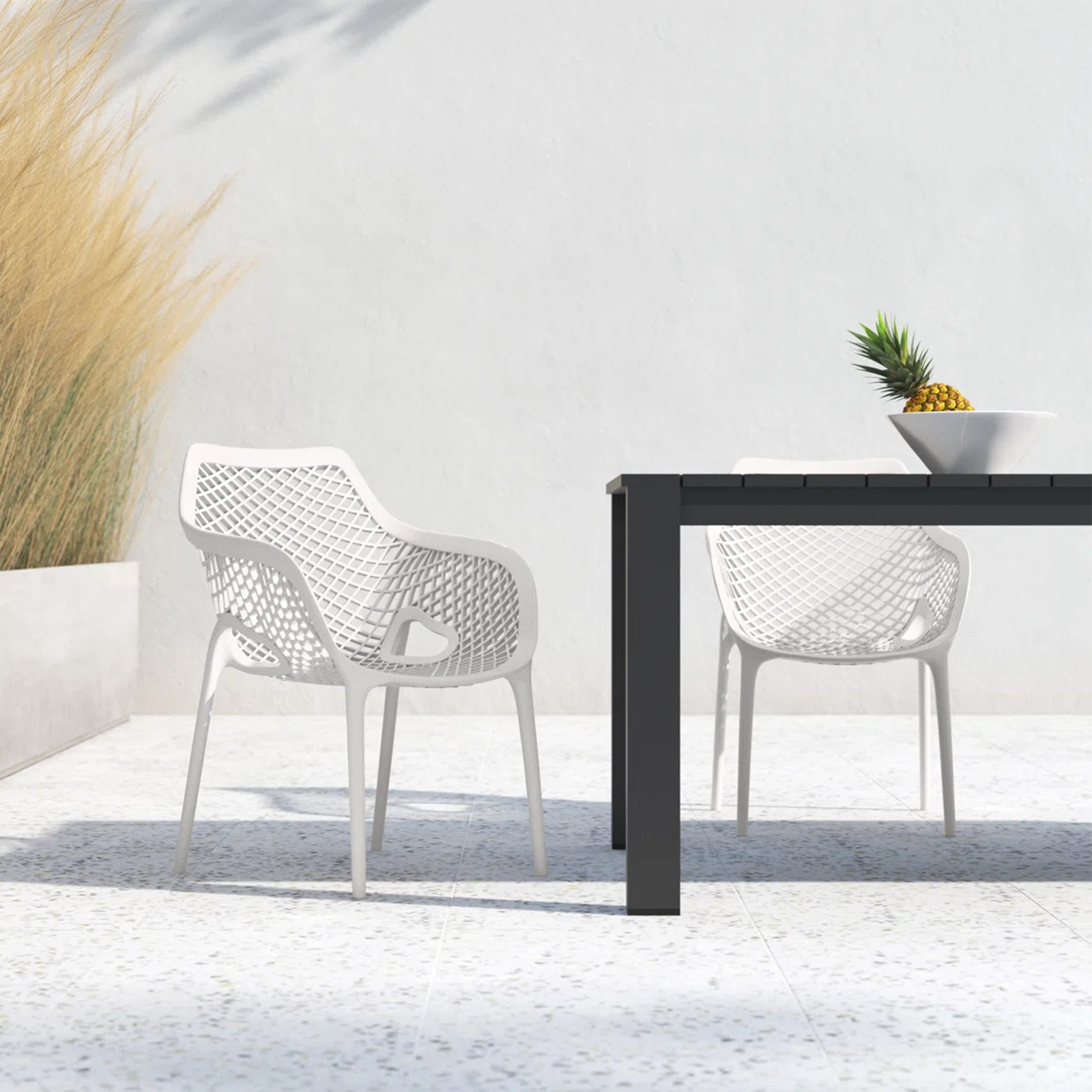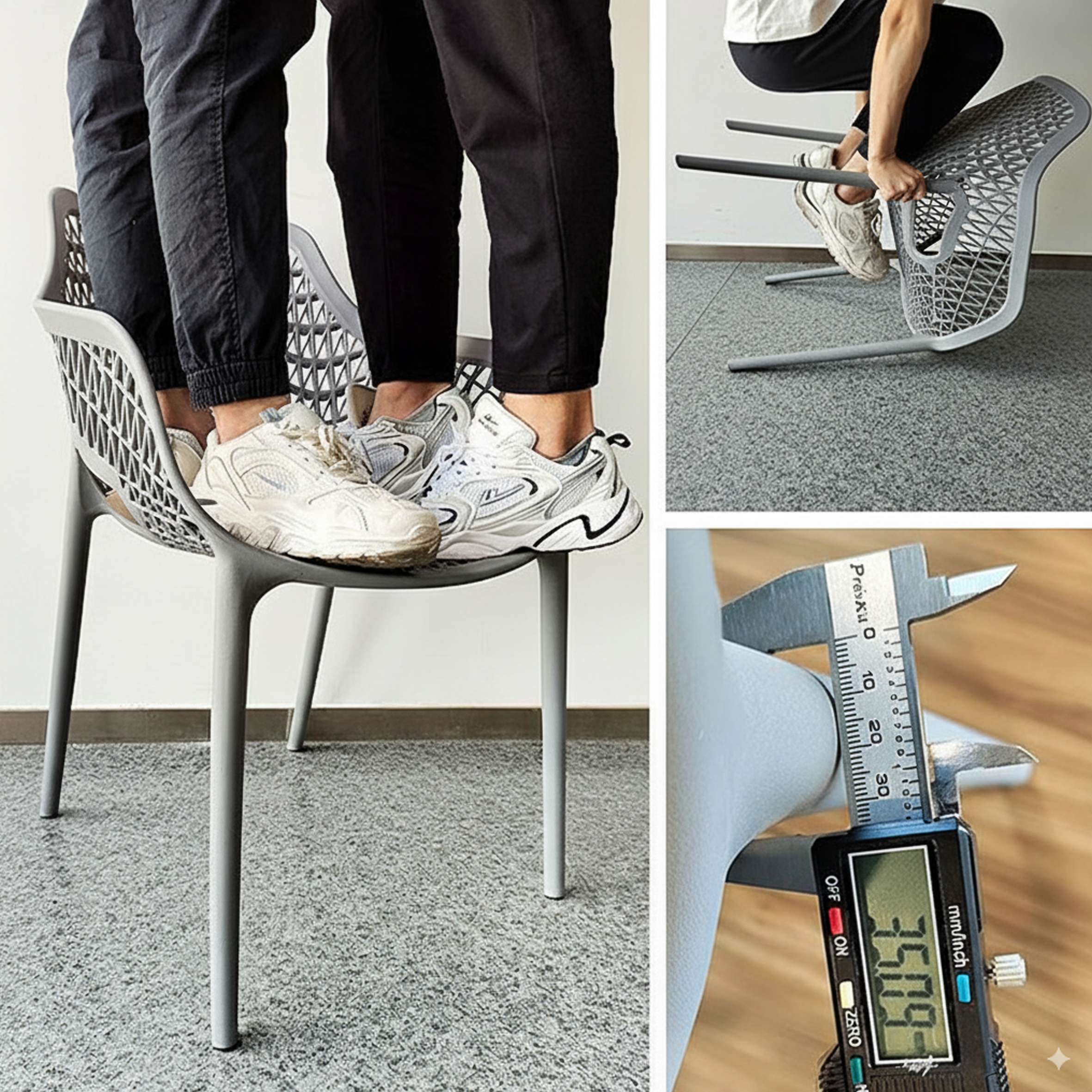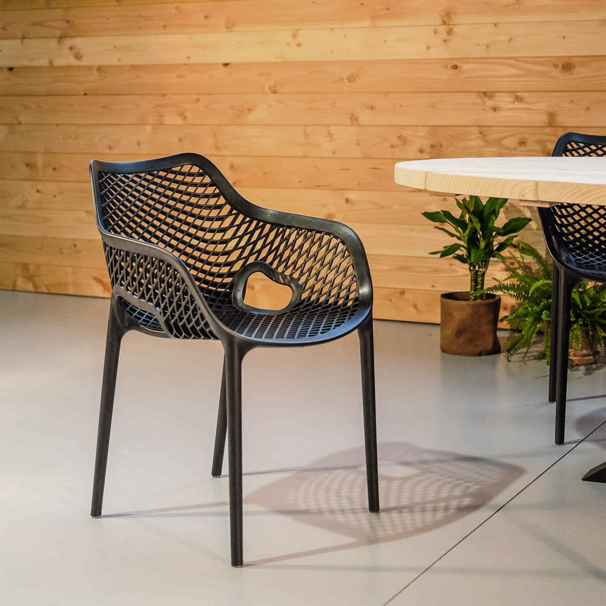 El material de las sillas es de polipropileno, un tipo de plastico muy versatil y ampliamente utilizado en la fabricaci{on de productos textiles, piezas de automoviles, electrodomesticos. Se caracteriza por su resistencia al calor y a la fatiga.