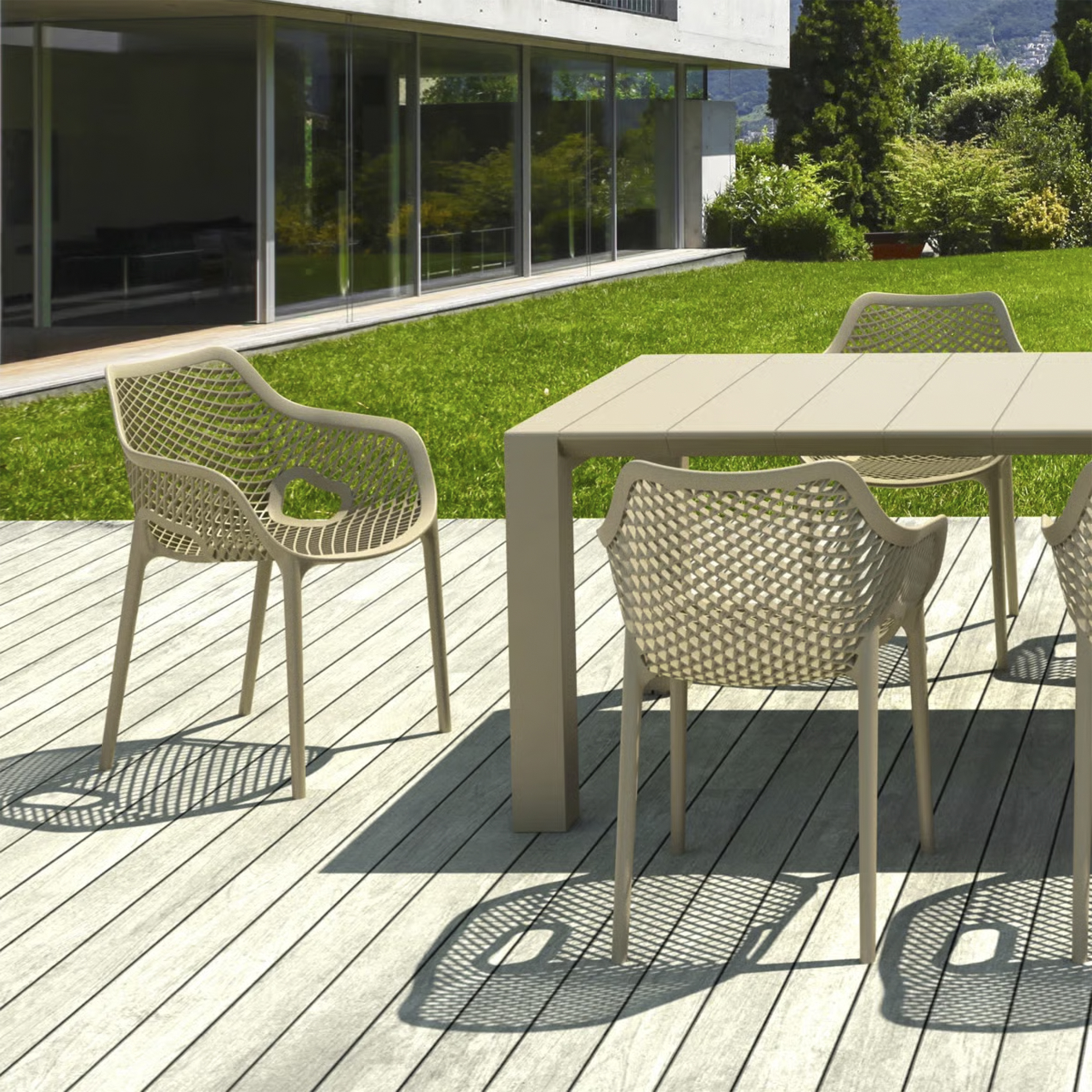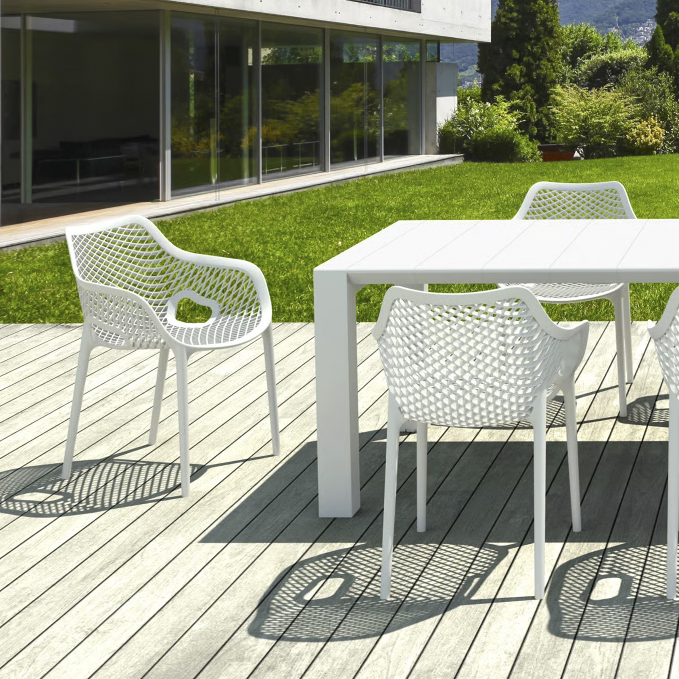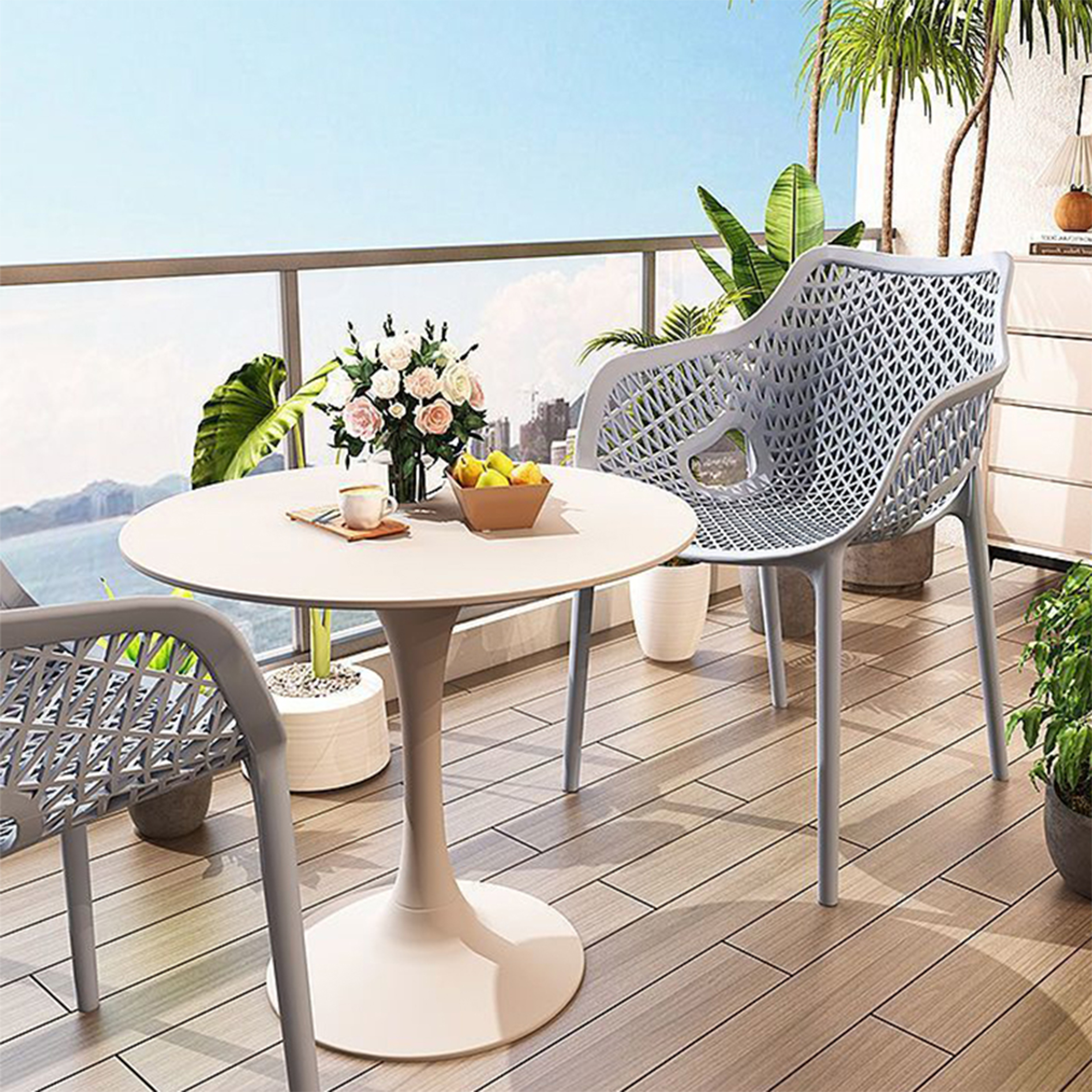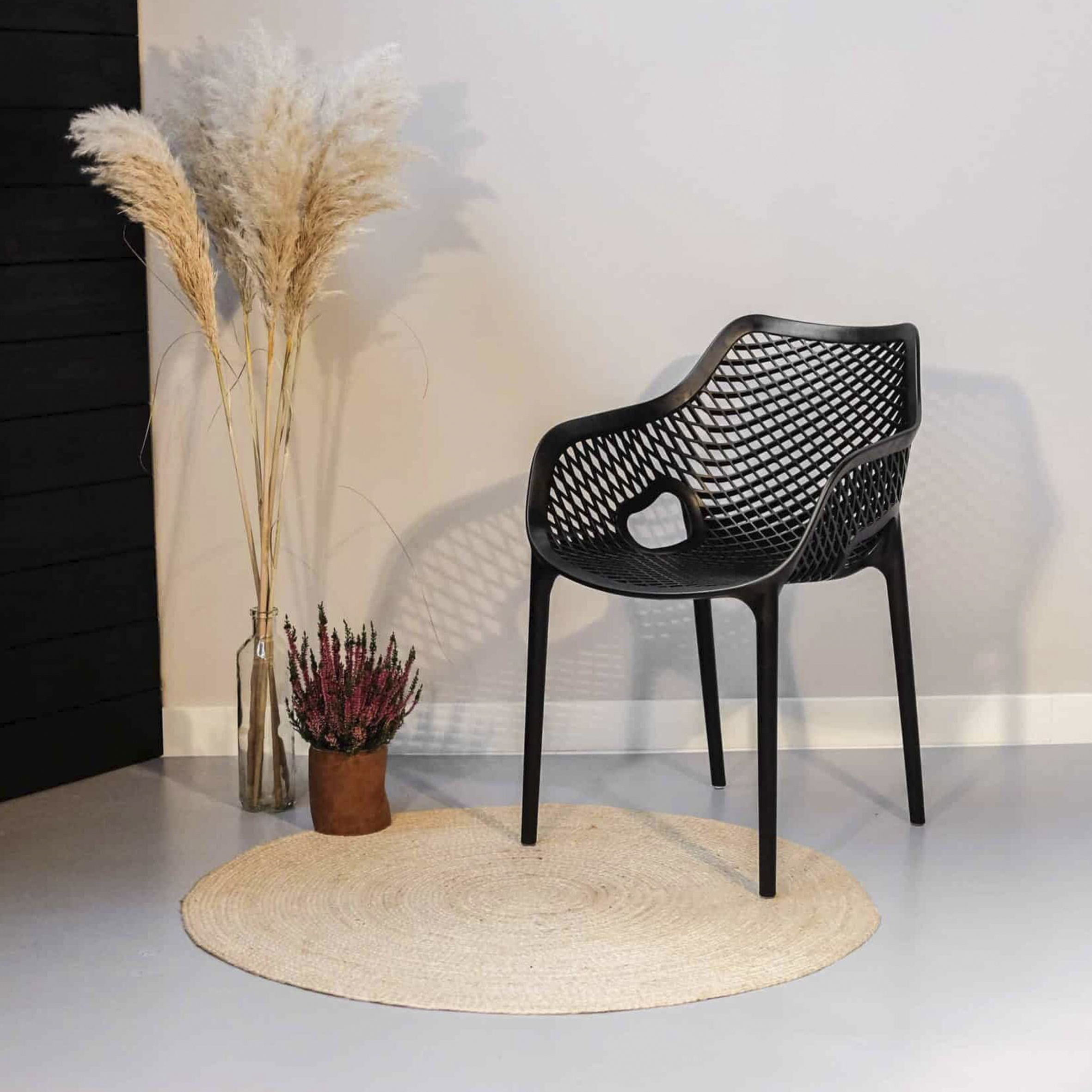 El material de las sillas es de polipropileno, un tipo de plastico muy versatil y ampliamente utilizado en la fabricaci{on de productos textiles, piezas de automoviles, electrodomesticos. Se caracteriza por su resistencia al calor y a la fatiga.